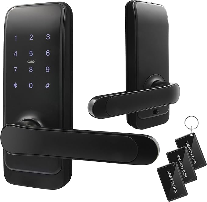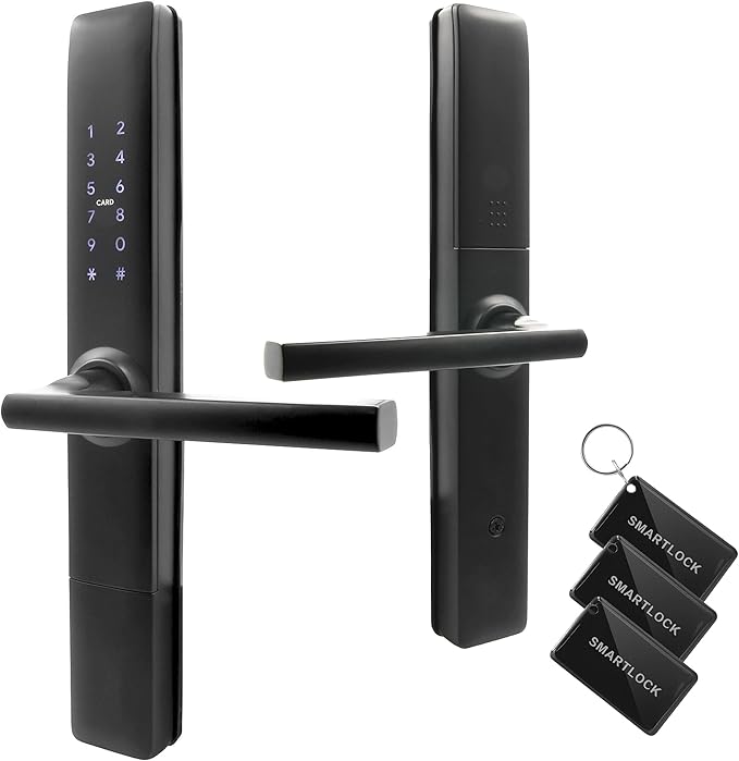 Cerradura electrónica inteligente con múltiples métodos de acceso: teclado numérico, lector de huella dactilar y tarjeta RFID. Ofrece seguridad y conveniencia para puertas interiores o exteriores.