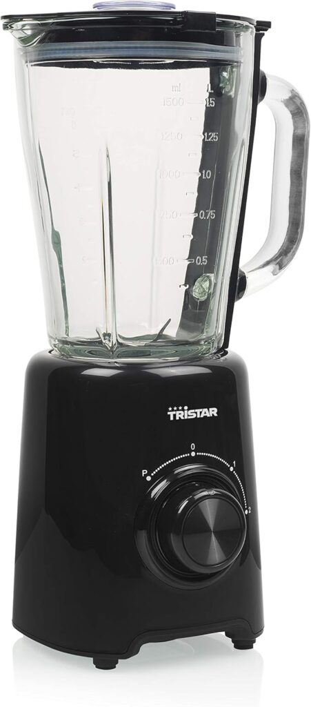 Batidora de vaso con jarra de cristal de 1.5 litros, 500W de potencia, dos velocidades y función de pulso. Ideal para preparar batidos, smoothies y otras bebidas.