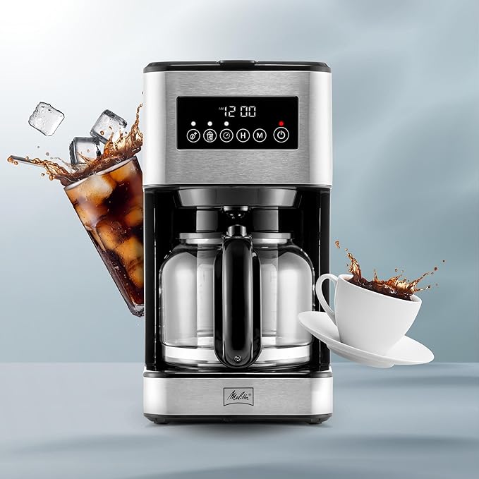 Cafetera de goteo programable con pantalla táctil, ideal para preparar café caliente o helado. Cuenta con funciones como Aroma Control y temporizador.